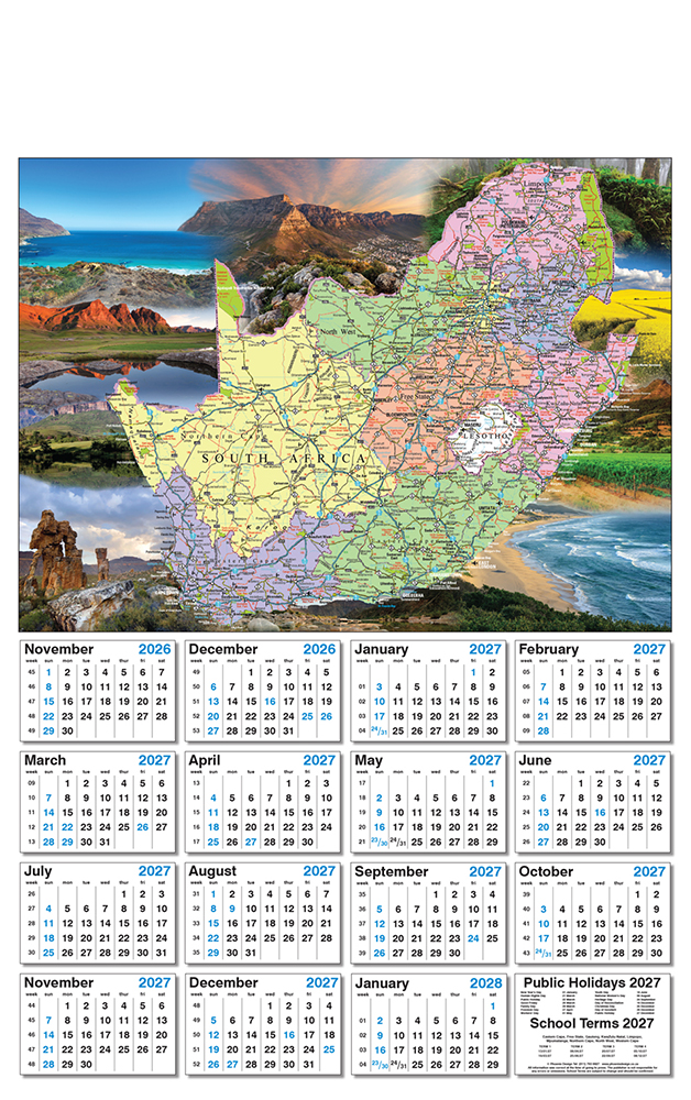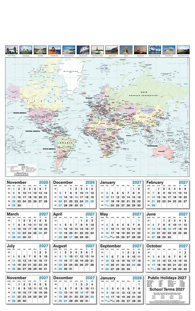 Map Posters All posters are printed on top quality 170gsm gloss art paper and rimmed top and bottom in gold. SA Map World Map Prestige Posters Format: 1 Page Portrait Size: H 900mm x W 565mm Advert Area: H 100mm x W 535mm Finishing: 170gsm Gloss Paper & Rimmed top and bottom in Gold Prestige PostersPoster Calendars Map Posters Year Planner Freight Calendar